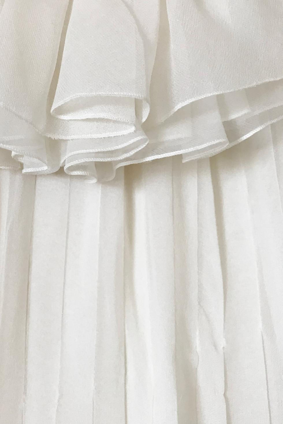 For this meticulously fabricated ivory chiffon gown from 1973, Mr. Valentino utilized vertical ruffles at the end of the pleated skirt and the shoulder tops to provide a sense of nobility.